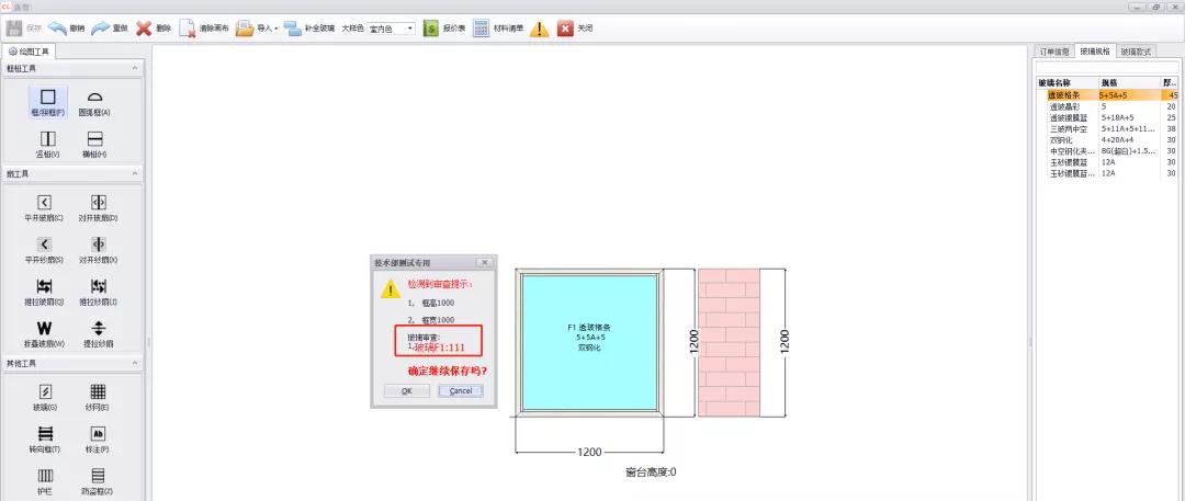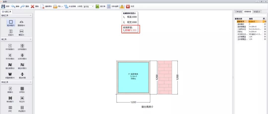 功能:当客户画图添加的玻璃不满足设置的尺寸时,订单审查内会多出玻璃限制条件中设置的提示内容,该功能只在经销商端生效。